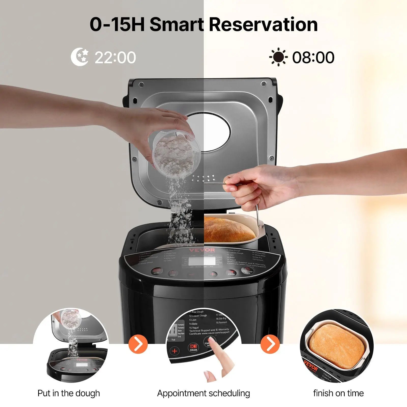 15-Hour Smart Timer & Keep Warm: Schedule your baking up to 15 hours in advance and enjoy warm, fresh bread anytime with the 1-hour automatic keep-warm function.