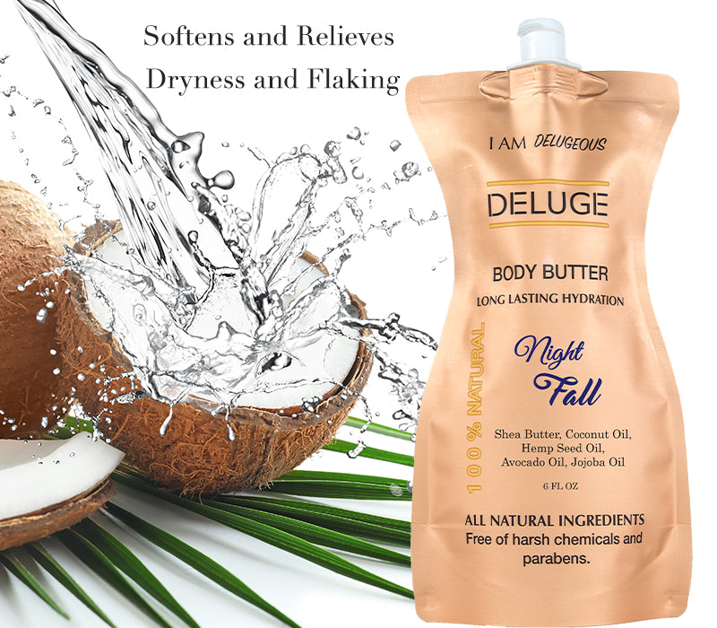 Our Deluge Body Butter Night Fall have a combination of ingredients that provide a dose of extra moisture to help maintain the natural and optimal levels of hydration, without modifying or altering the cellular structure of the dermis, and also provides other benefits thanks to the natural oils and butters such as Shea Butter, coconut oil, hemp seed oil, avocado oil and jojoba oil which provide essential natural vitamins such as A, B, E, K, Omega 3 and 6. Our Body butters are Composed of 100% pure natural ingredients and have been created to care for and protect any skin type. No matter the type of dermis you have, our butters are suitable for all skin types and ages: normal, mixed, fat, dry or sensitive, and is suitable for both men and women. Deluge Butters enhances cellular regeneration, so in addition to providing water, it contributes to the skin improving the appearance, maintains firmness, reduces marks and scars and recovers brightness and luminosity. Deluge Body Butter forms a protective barrier between the skin and the elements. This traps moisture in, keeping irritants out. It keeps the skin hydrated all day. It performs double the duty when it comes to skin hydration.