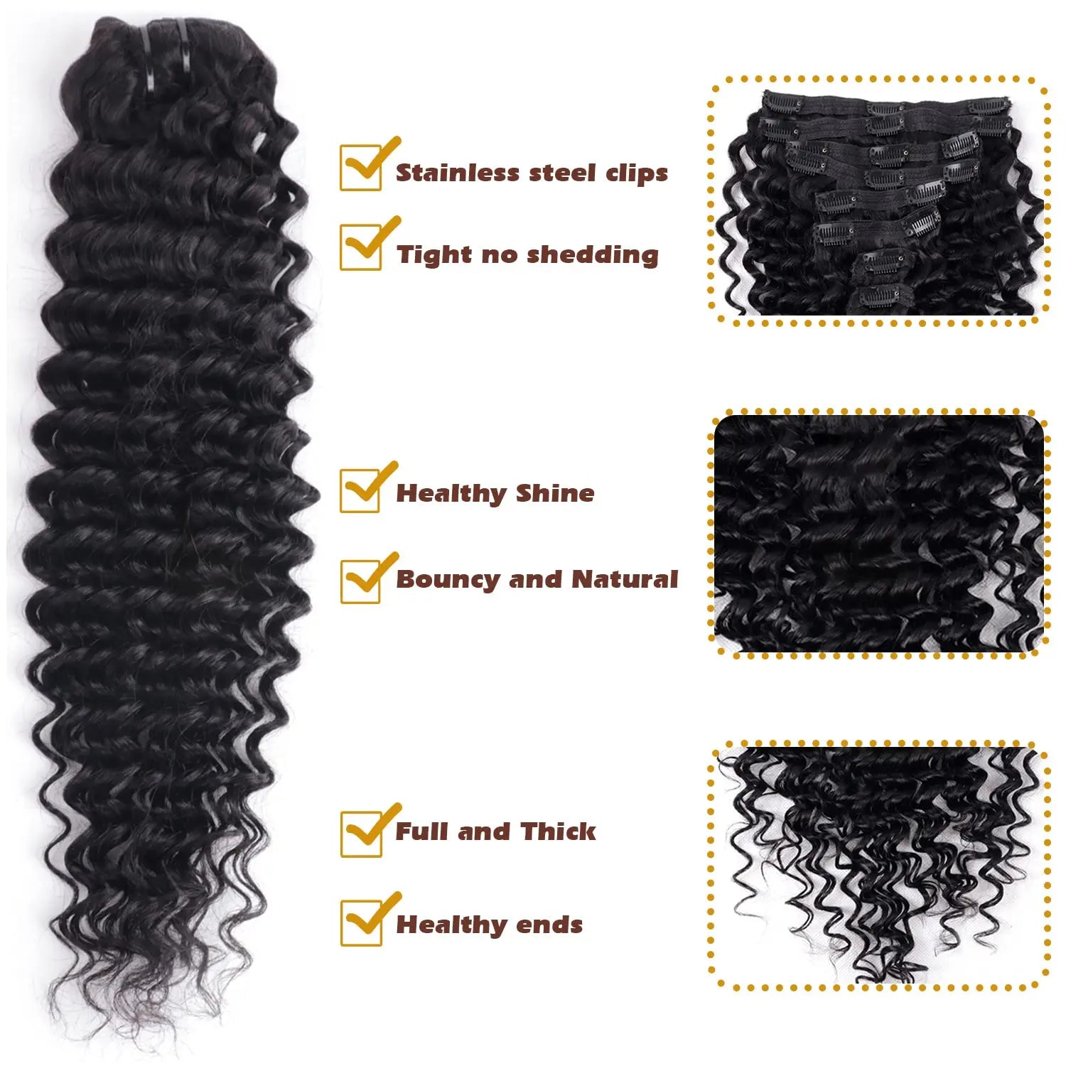 These Deep Wave Clip Ins Human Hair Extensions for Women are made from high-quality Remy hair, providing a natural and curly texture from root to ends. With a weight of 120g per set and 8 pieces included, these extensions are suitable for all hair colors and can be permed without worry. Additionally, they are free of high-concerned chemicals, making them a safe and versatile choice for those seeking thick, curly hair.